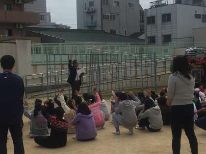 避難後は、校長先生消防署の方のお話を聞き、自分たちの避難の方法を振り返りました。