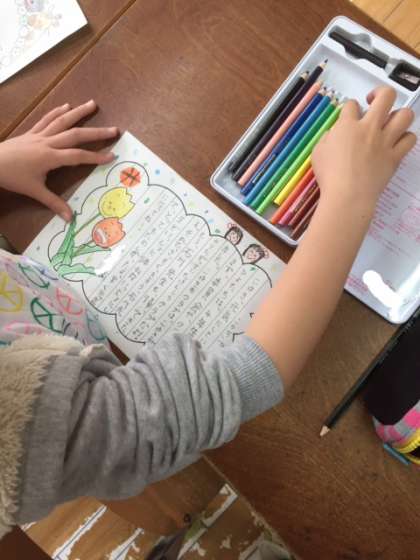 入院しているお友達にお手紙を書きました。丁寧に色をぬったり、たくさんの文章を書いたり、それぞれの想いがつまった1枚ができあがりました。「入院しているとき暇やし、読んでほしいな。」などとつぶやきながら、お友達の回復を願っていました。