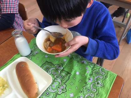 今日は、ビーフシチューに入っている「にんじん」を給食調理員さんが、ラッキー人参を作ってくださいました。
