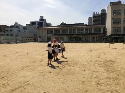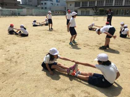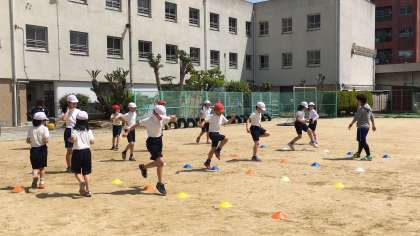 マーカーをおいて、その間をいろいろな走り方で駆け抜けて、効果的な走り方を学びました。
