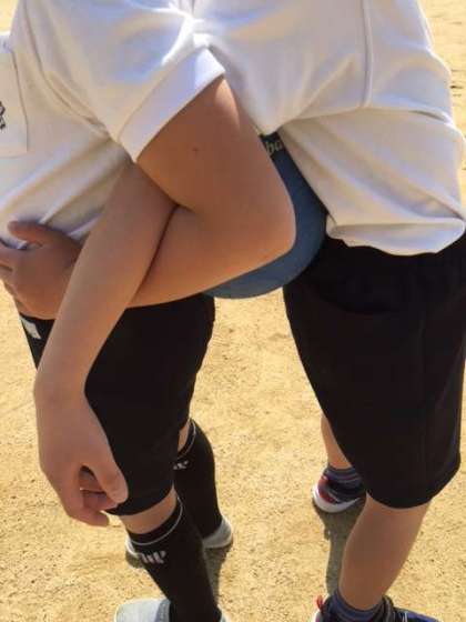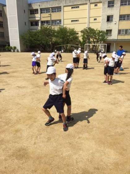 体育の学習の一場面。背中合わせに座り、「せーの!」の声で立ち上がる運動遊びをしました。次は背中にボールを挟み、落とさないようにやりました。これがなかなか難しいようでした。立ち上がってからはそのまま右へ左へ、2人の息を合わせてがんばりました。