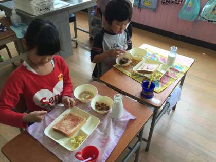 今日の給食で1年生は、食パンにいちごジャムを塗っていました。みんな上手にパンに塗ることができていました。