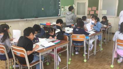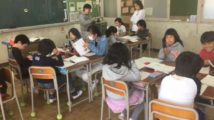 同じ班の友達同士聞きあって、良かったところなどをアドバイスしあっています。