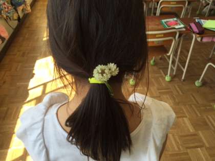 休み時間になると、子どもたちはそのシロツメクサをたくさん集めてきて、花束をつくったり、髪飾りを作ったりして、遊んでいます。
