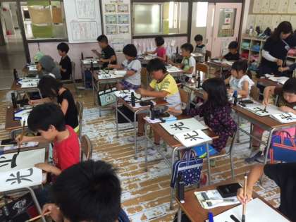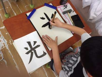 今日のお題は「光」です。「はらい」や「はね」がポイントです。とても真剣な表情で、一画一画丁寧に書いていました。