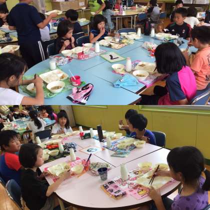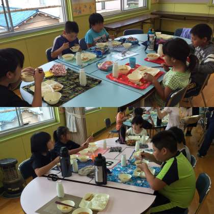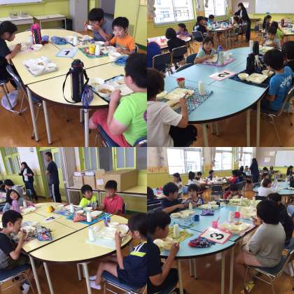 今日は、3年生と4年生がランチルームで交流給食を行いました。
