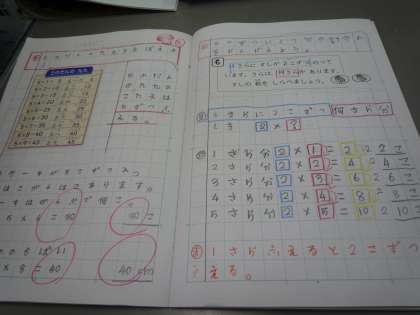 かけ算の学習はもちろん、新しいノートの取り方についてもはりきって取り組んでいます。