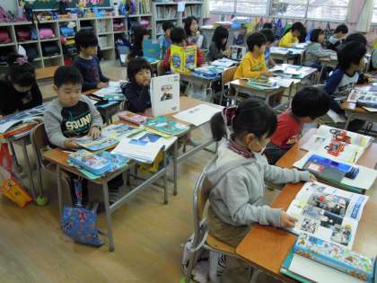 子どもたちは、自分で選んだ乗り物の本を一生懸命読み、「○○は〜のための・・・です。」という国語の教科書をまねて、文の書き方を習得しようとがんばっています。