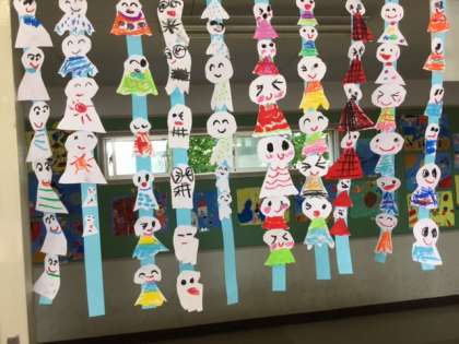 重ねて切る学習で、てるてるぼうずを作りました。画用紙につなげて貼って、窓に飾っています。