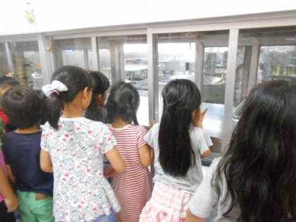 まずは今西先生に給食室に連れて行ってもらい、外から給食室の様子を見せてもらいました。大きなお鍋や、大きなしゃもじをみせてもらい、子どもたちはとても驚いていました。