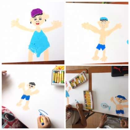 まずは、楽しそうに泳いでいる自分を描き、その周りに海の生き物を描きます。今日の1時間ではまだ完成ではありませんが、とっても楽しそうな様子がわかりますね♪