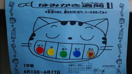 また給食後の歯みがきができた児童はカードにシールを貼り、はみがき習慣化の意識づけをしました。毎日はみがきできた児童はキラキラシールを貼っています。今日、家に持って帰らせますので、見てあげてください。