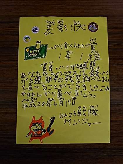 健康戦隊ナインジャー(健康・給食委員会)が給食後、栄養バランスの整った給食を残さず食べたかチェックしました。全学年、ほぼ毎日給食を残さず食べることができました!!全学年に表彰状を渡すことができました。