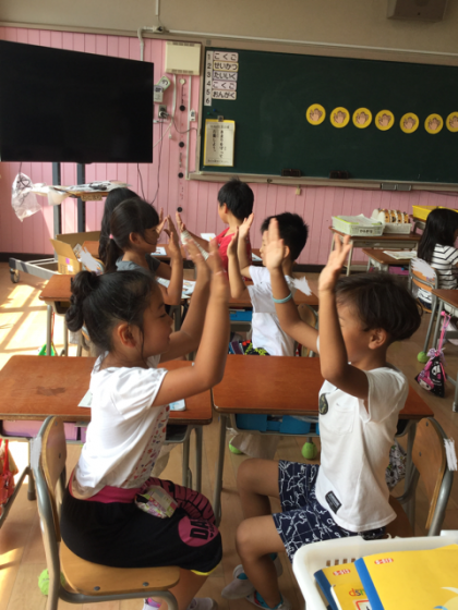 まずは手拍子で練習をして、次はお隣のお友だちと合わせて手を打ちます。