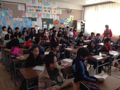 修学旅行前集会で中学年でメッセージを伝えました。まず、教室で練習して講堂で発表しました。1・2年生の手本になるように、5・6年のやる気が起きるような発表になったと思います。8月6日にみんなで作った鶴と、ウリナラの児童の作った亀を広島に届けてほしいと思います。みんな元気に行ってらっしゃい!!