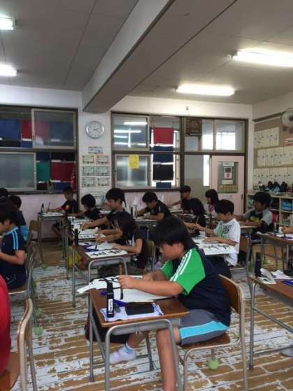 今日の午後からの学習は習字でした。「左右」の字を書きました。最初に書き順を確認し、字のバランスをとらえました。毎回書いた字を反省し、次の字にそれを生かしました。みんなよい緊張感を持ちながら、「さっきよりもうまくできた!」と喜んでいました。