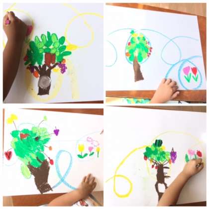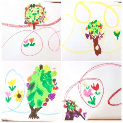 今日はパスでくるっと枠を作り、その中にふしぎな木やきれいなお花を描きました。