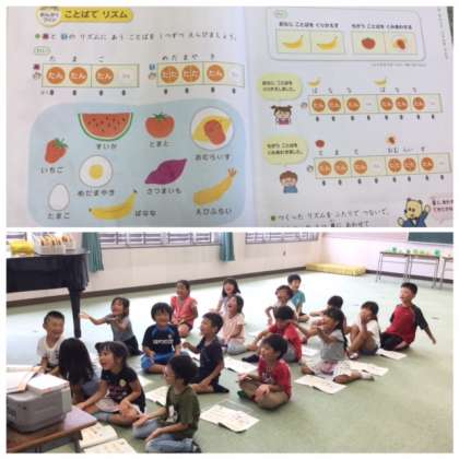 授業の後半は、「ことばのリズム」でリズムあそびをしました。3拍の長さに合わせて言葉を入れ、リズムに合わせて手を叩きます。言葉によっては難しいですが、練習していくうちに、どんな言葉でもリズムに合わせられるようになりました^^
