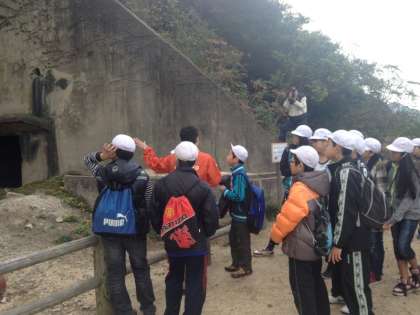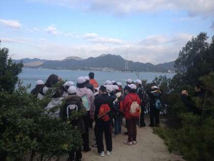 今、6年生は大久野島のフィールドワーク中です。大久野島は戦時中、毒ガス製造工場がありました。工場があることは秘密にされ、働いている人は、家族にでも仕事内容を話してはいけませんでした。今は観光地となっている大久野島には、毒ガス貯蔵庫や倉庫など、そのときのなごりが残っています。島の職員さんに案内してもらいながら学習を進めています。
