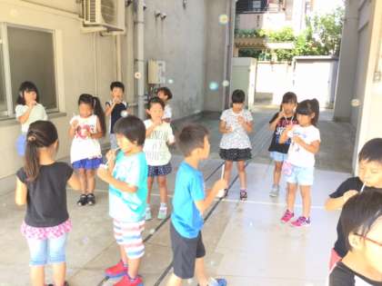 今日はどこのお家にもある洗剤と水を使って、しゃぼん玉をしました。初めは強く吹きすぎてなかなかうまく膨らませませんでしたが、コツをつかんで上手にしゃぼん玉を作っていました。