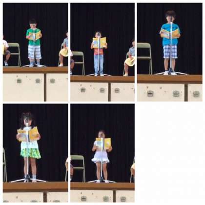 1年生からは5人の代表が、国語の「こんなことしたよ」で書いたことを発表しました。プールのことや公園探検のこと、みんな遊びのことを様子がよくわかるように書けていました。