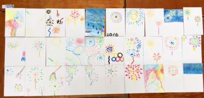 暑中見舞いのはがきの絵を描きました。きれいな花火の絵がいっぱいです。これからどんなものができるのか楽しみです。