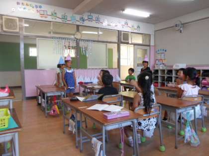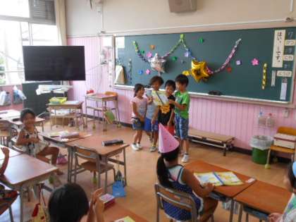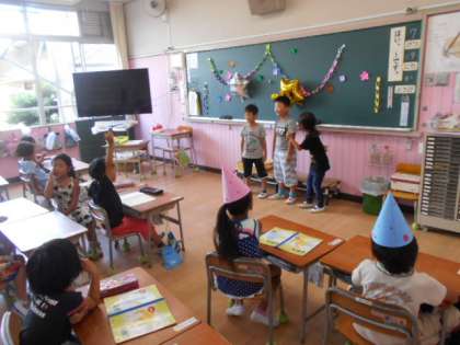 今日は、7月のお誕生日会をしました☆今回のお誕生日会は、各グループごとに出し物を考え、みんなで楽しみました♪まずは、みんなでハッピーバースデーの歌を歌って、7月のお誕生日の人のお祝いをしました。そして、なぞなぞ、○×クイズ、ものまね、ダンス、飾りの5チームに分かれ出し物をしました。それぞれのチームごとに盛り上がり、答える人も、みんな手を挙げて一生懸命に答えていました。また二学期のお誕生日会も楽しみだね♪