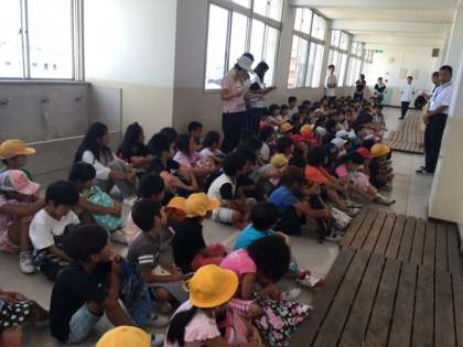1時間目は、教室で防災について学習しました。火事や地震、津波が起こったときにどうするかを紙芝居を見ながら学習しました。中にはクイズもあったので楽しく学べたようです。