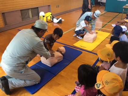 避難訓練の後は、防災ブースを見学しました。災害時に使われる簡易トイレやマットを見せてもらったり、心臓マッサージを体験させてもらったりしました。