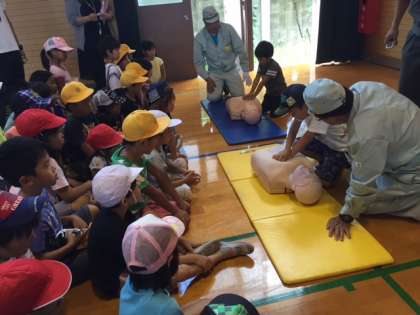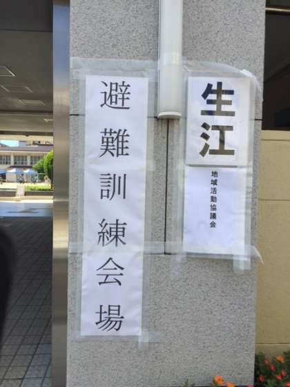 避難訓練の後、地域と連携した防災訓練に参加しました。地域対策本部・救護所・避難用品の展示の見学・体験をしました。