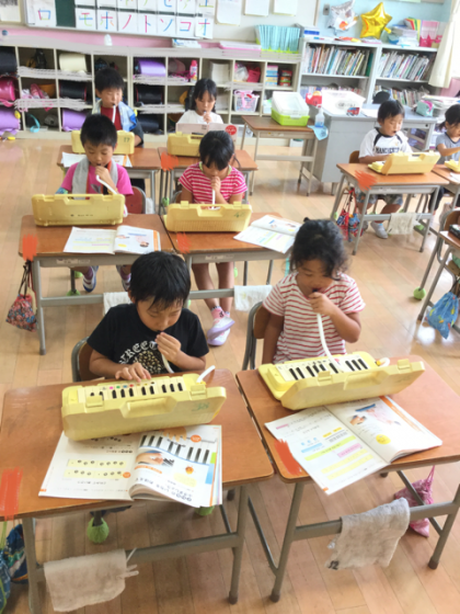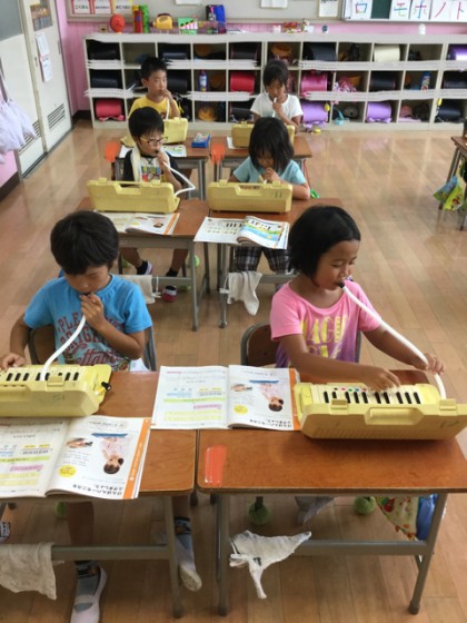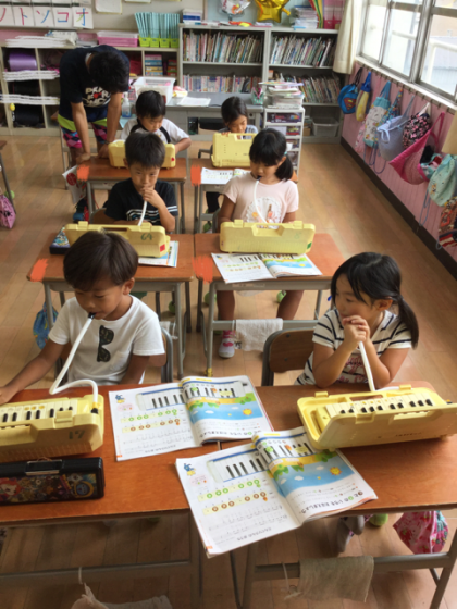 2学期が始まり、音楽では鍵盤ハーモニカの学習が始まりました。幼稚園や保育所で経験のある子もいるようですが、初めて触る子もいてとってもドキドキしていましたよ。