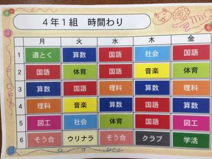 パソコン大好き4年生。今日は2学期の新しい時間割を自分でつくりました。パソコンのソフトをつかって、デザインを選び、教科名を打ち込んでできあがりです。慣れている子はすぐにできてしまいました。大切にしてほしいですね。