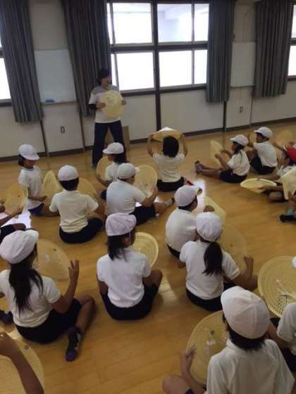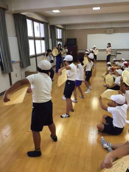 かぶる笠を持って、動かしながら踊ります。動きが少なそうに見えますが、腰を落としてかっこよく踊るととても疲れます。子どもたちはとてもやる気になっています。これから楽しみです。