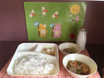 今日の給食では、1日早い「月見の行事献立」がでました。また、芋を使った「鶏肉とさといもの煮もの」、だんごを使った「みたらしだんご」がでました。