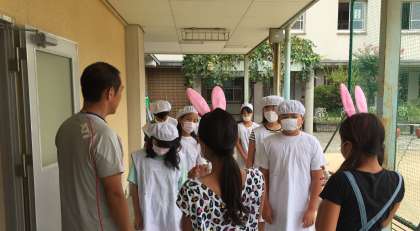 給食室前でも月見にちなんで、けんこう戦隊ナインジャー(健康・給食委員会)の給食チエック当番の人がうさぎになってくれました。
