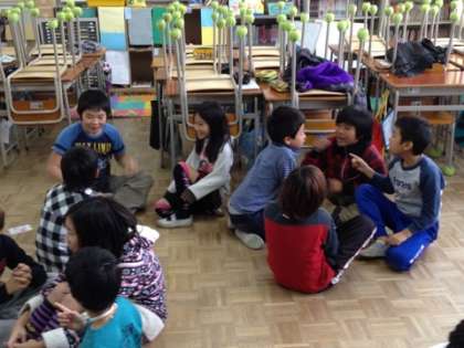 総合の時間に、友だちのことをもっと知るためのアクティビティをしました。名前は「共通点をさがせ!」3〜4人組を作って、そのグループ全員の共通点を見つけ出し、発表し合いました。