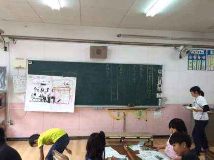 広告と説明書を読み比べて、それぞれの目的に合った書き方の学習を進めています。今日はその学習を生かし、子供用目薬の広告をみんなでつくりました。説明書をもとに、キャッチコピーや見出しを自分たちで考え、見た人が買いたくなるような広告を作り進めています。難しい課題ですが、みんな意欲的に頑張っていました。