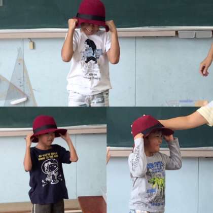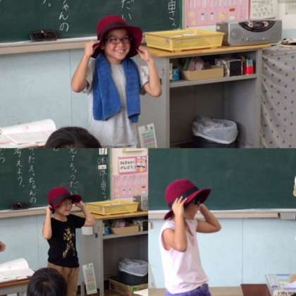 実際にぼうしを被って、その時の様子をみんなで考えたり、文章から考えたり、クラスみんなで想像力を膨らませながら再現しました。