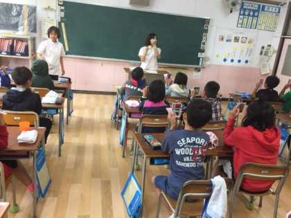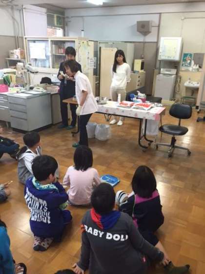 今日は歯医者さんと歯科衛生士の方が来校され、児童たちに歯磨きの大切さを教えていただいた後に、フッ化物塗布を行いました。初めての体験という子が多く、慣れない味に悪戦苦闘しながらも、なんとか乗り切りました。子どもの歯にはフッ化物がよく馴染むそうで、丈夫な歯ができるそうです。
