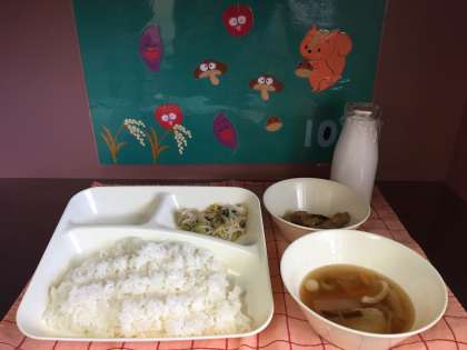 給食を食べながら楽しそうにしていました。