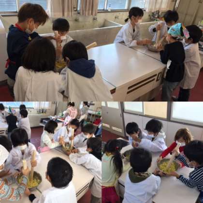 グループみんなで力を合わせて、おいもを潰し、カップに入れました。