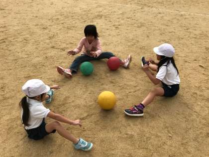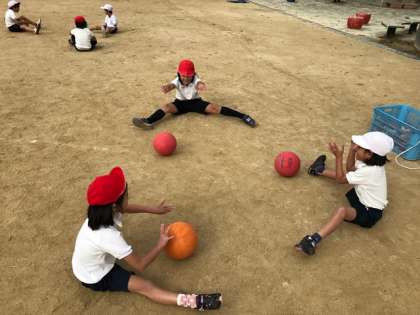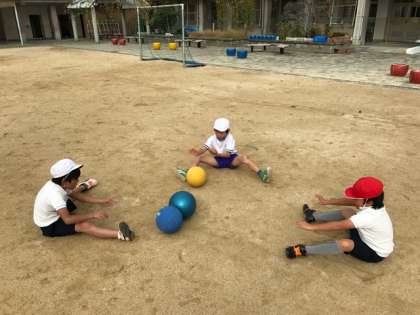 今体育ではボールを使って始めのウォーミングアップ(体操)を行っています。