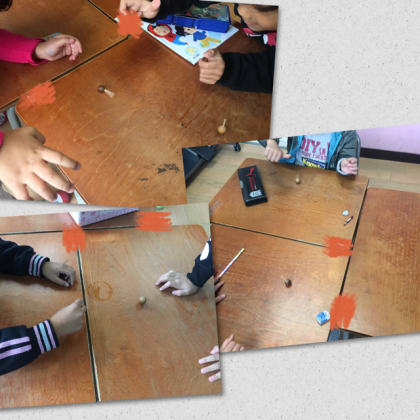 どうすれば上手にくるくる回るか、回し方を研究しました。上手に回せた子は、どうやって回しているかをほかの子に伝授したり、似ているどんぐりの持ち主同士が集まって作戦を考えたり、とてもおもしろかったですよ^^
