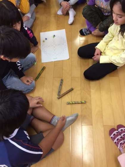 今日の5時間目に、ソンセンニムがウリナラのすごろく遊び「ユンノリ」を教えてくれました。日本ではサイコロを使いますが、ウリナラでは木の棒を落とし、表裏の数で数を決めます。