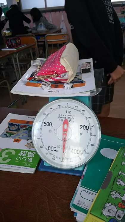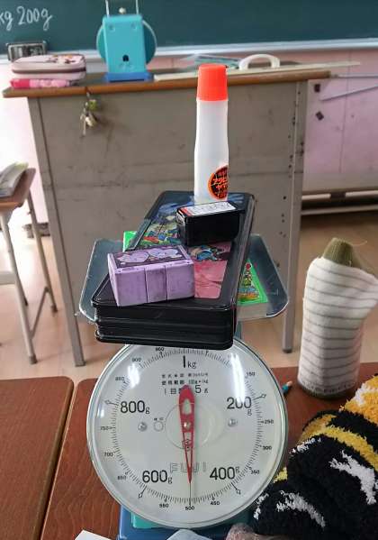 重い 軽いということは生活経験で知っているけれど、それを新しい単位と数を使って表す学習です。