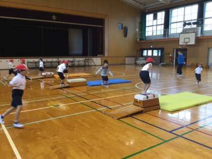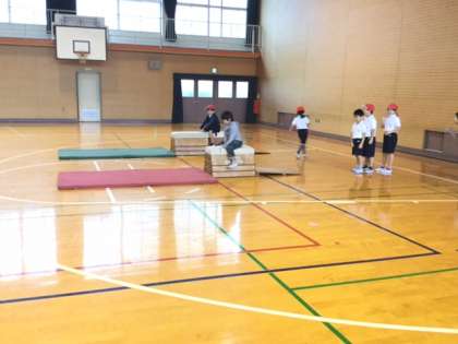 今日は、少し高いとびばこにまたがり、手の力も使って前に進んでみました♪ヨイショ、ヨイショと前に進み、最後はピョンと跳び下ります。とびばこに、だんだんと慣れてきた一年生です(^.^)