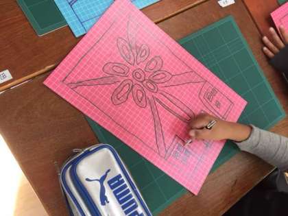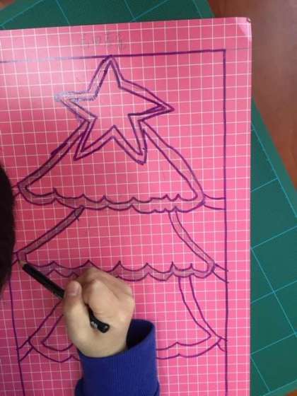 図工の時間に新しく取り組んでいるのは、ステンドグラス作りです。といっても、厚紙と色のついたセロハンを使ったものです。自分の好きなデザインを考え、光が差し込むように工夫してスペースをつくります。うまくつながっていないと大事な部分まで切り落としてしまうので、確認のために色をつけました。