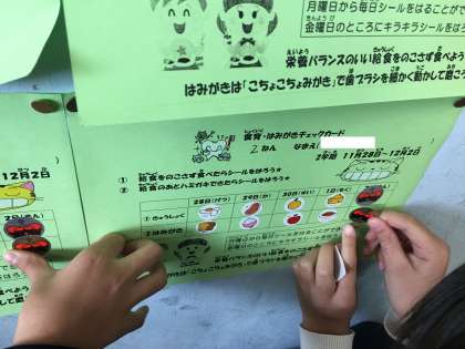 その間、給食で残さず食べられた人と給食の後のハミガキができた人は、シールを貼り、毎日できた人は、最後の金曜日にキラキラシールを貼りました。ほとんどの児童が達成することができました。