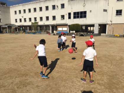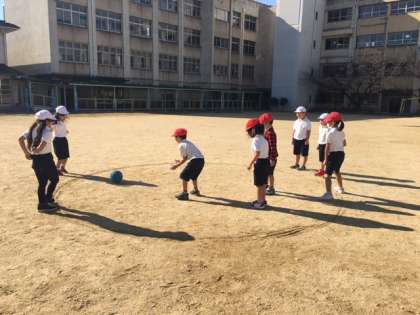 今日の体育は、転がしドッジボールをしました♪いつもみんな遊びでしているドッジボールとは違い、コートは丸く、ボールは転がして相手に当てるゲームです。外野の人は、よーく狙ってボールをコロコロ転がしてみるのですが、内野の人もボールを避けるのが上手なので、とっても白熱したゲームとなりました(^.^)