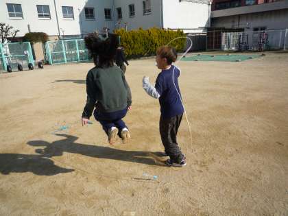 あやとび、交差跳び、二重跳び、二人跳び、四人跳びなど、なわとび集会で教わった跳び方をもっともっとできるようになりたい様子です。